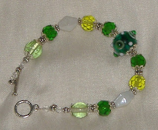 Descrição: pulseira feita com contas de vidro em tons verdes e branco e intermeios em metal.