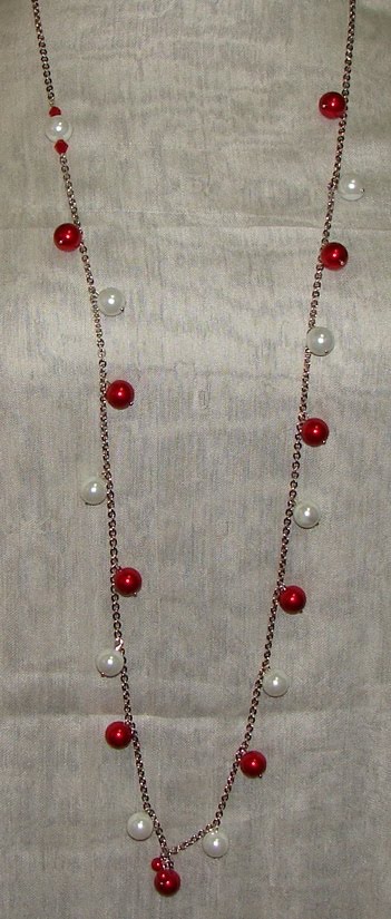 Descrição: corrente de metal e pérolas de vidro vermelhas e brancas