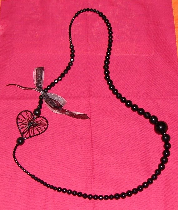 Descrição: Pérolas de vidro de cor preta de vários tamanhos, contas acrílicas de cor preta, coração de metal preto e laço em organza sobreposição rosa seco e preto.