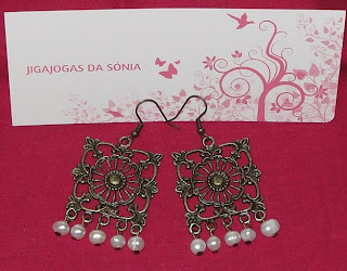 Descrição: Base metálica de cor bronze e pérolas de cultura pequenas.