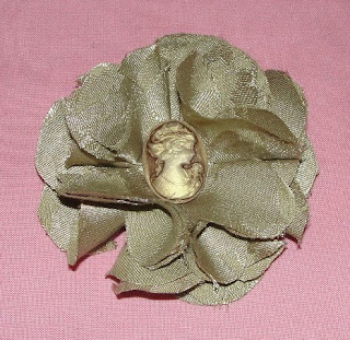 Descrição: Alfinete de peito feito em tecido com tom dourado velho com camaféu dourado velho no interior.