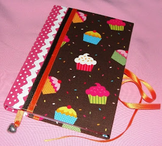 Descrição: Agenda diária 21,5 cm x 15 cm com lista telefónica integrada. Agenda forrada a tecido, de cor castanha com cupcakes coloridos e lombada com tecido rosa às bolinhas brancas. Adornada com fitas de cetim de cor laranja, castanha e espiguilha branca. Encerra como diário com marcador em fita de cetim laranja com pendente em metal com feitio de coração.