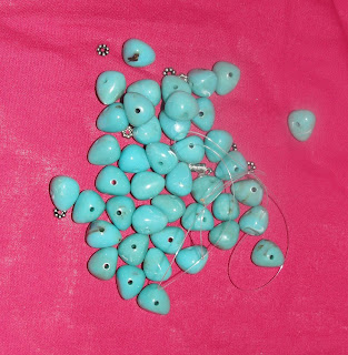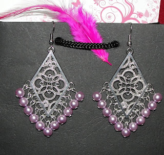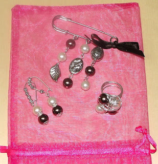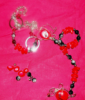 A C. tinha um colar que lhe tinha sido oferecido e não gostava muito dele. Com o aproveitamento de algumas peças do mesmo e acrescentando umas outras, ficou sem colar mas ganhou uma pulseira e uns brincos lindíssimos.