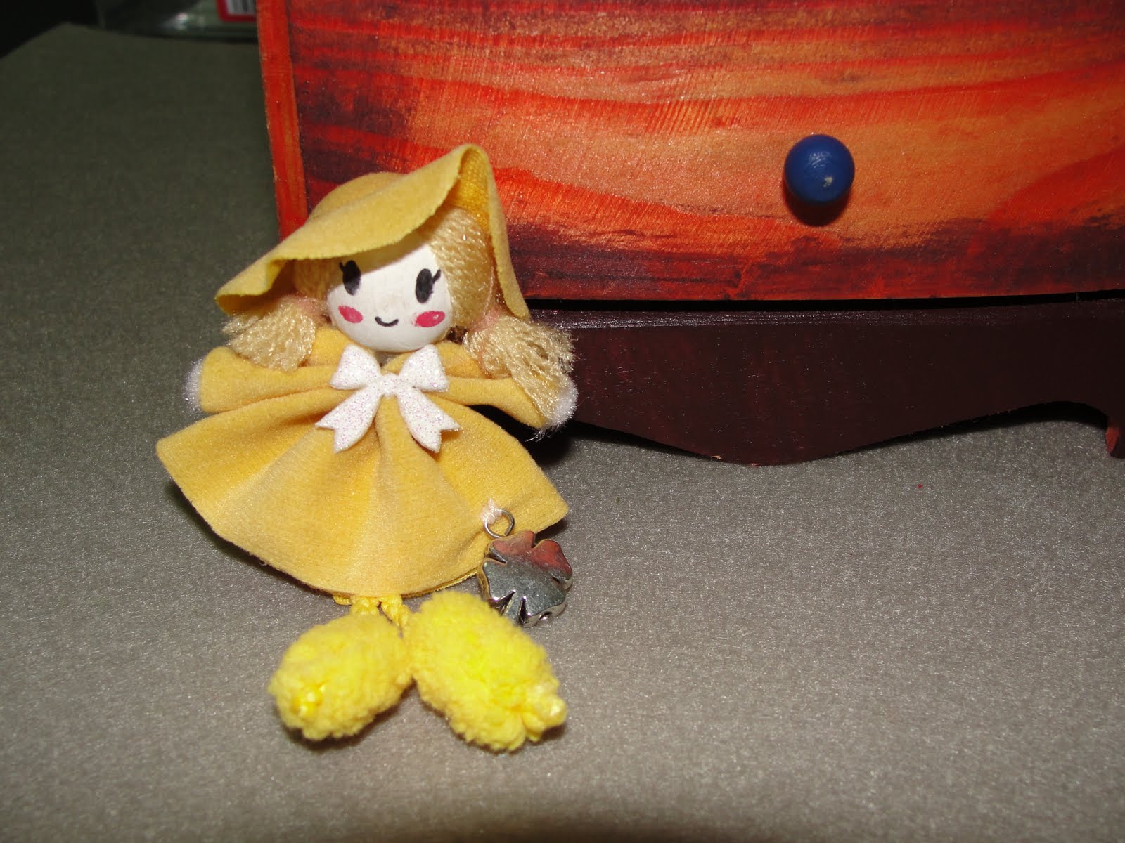 Descrição: bonequinha feita com tecido de veludo azul claro, com alfinete para colocar em qualquer tecido mole.