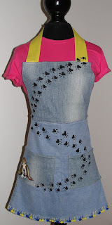 Este avental, é feito a partir da reciclagem de umas calças de ganga usadas, com pintura à mão e colocação de vivo em croché. Croché azul e amarelo, perguntam vocês?! Ah pois, a Cila sabe que eu sou uma mulher do NORTE, CARAGO! Como quem diz, do Bairro Norte da Póvoa de Varzim, cujas cores representativas são o azul e amarelo. Pormenores a que eu, como verdadeira leoa de signo, dou muito apreço. Convido-vos a visitar o blog da Cila http://artesdacila.blogs.sapo.pt para verem os trabalhinhos dela: pintura em tecido, madeiras e croché, tem coisas muito bonitas e aceita encomendas de pedidos à medida. Eu recomendo!