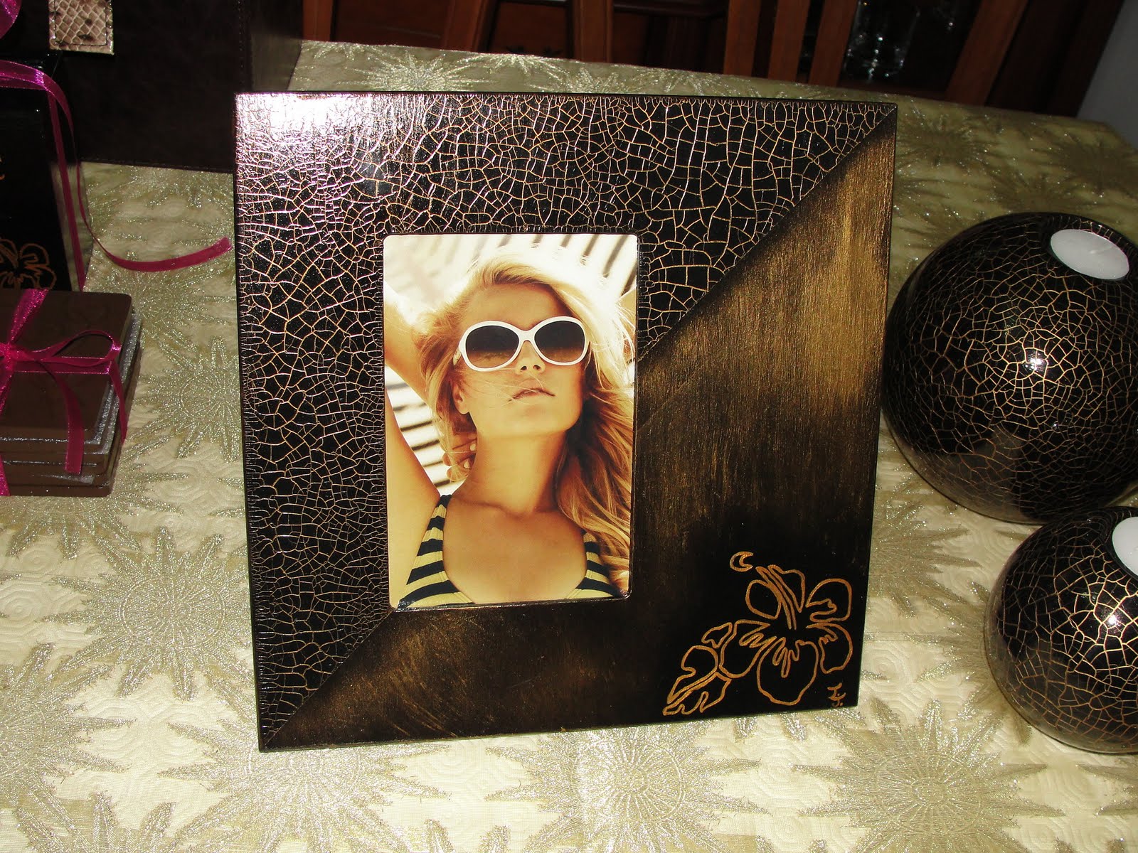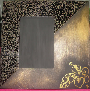 Descrição: moldura de madeira pintada à mão em preto, aplicação de craquelé, aplicação de patine dourada e pintura em dourado de flor, verniz finalizador.